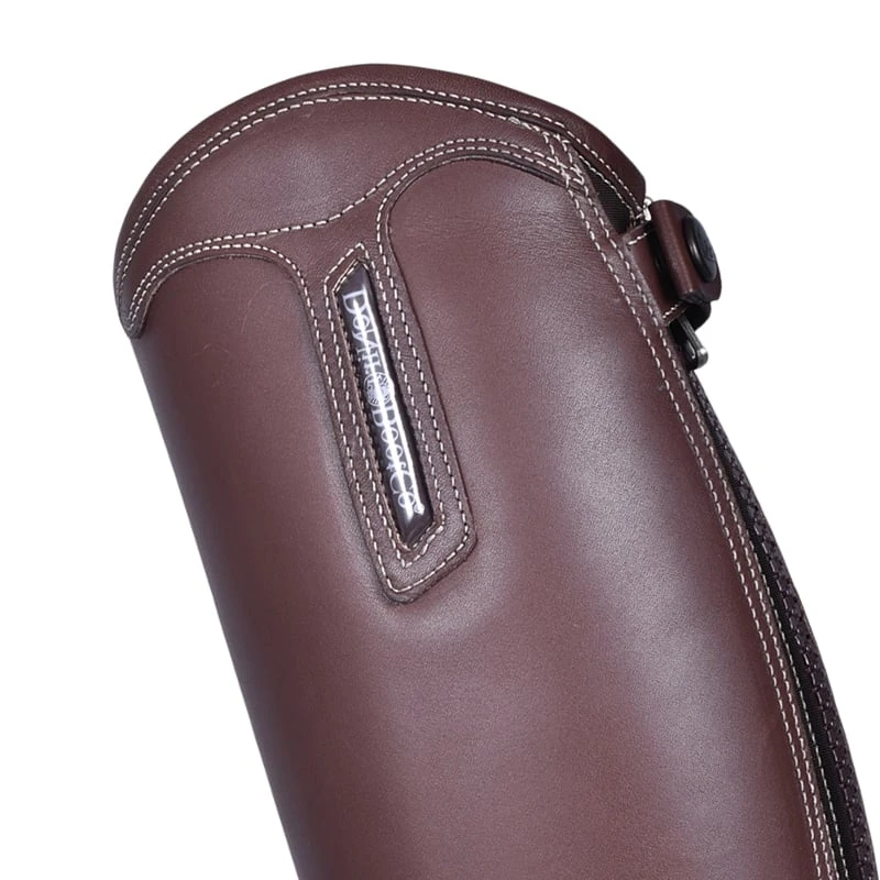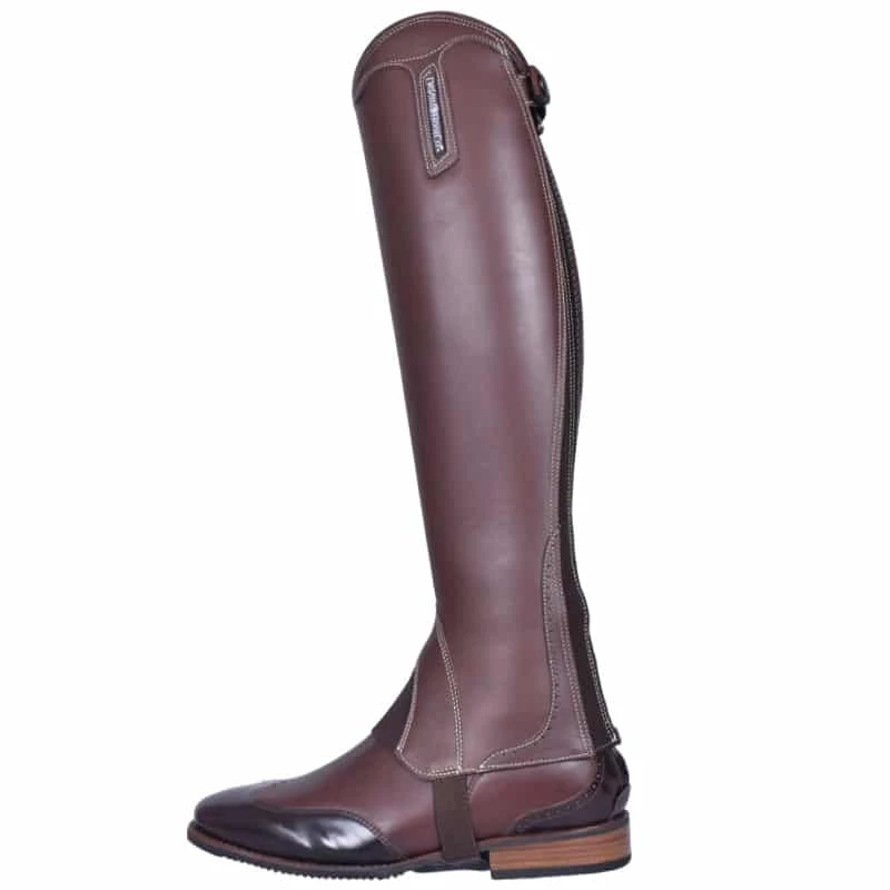 This Italia G-ITA De Niro gaiter is made in smooth brown 527 leather. This model has a zipper in the back, protected by a top and bottom zipper protector. This classic looking gaiter is equiped with a standard hunter top. The G-ITA gaiter is made of WRAT calf leather of the finest quality. The use of this leather ensure optimal comfort and a perfect fit. The inner lining of the leather is also made entirely out of calf leather, for an extra nice feel on the riders leg. Overall, this gaiter has a very elegant and modern look. Combine these gaiters with the De Niro T-ITA Knob Signature Brown or the De Niro T-ITA Cinderella short boots!