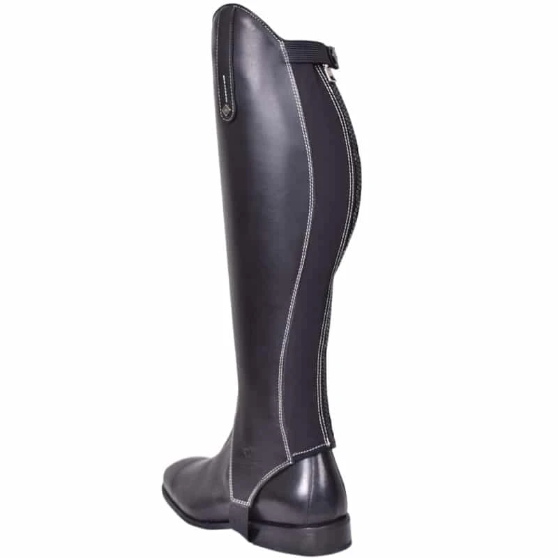 The DeNiro GH New 1015 Crust Oil gaiters are made in black with white contrast stitching. This model has a zipper in the back lined with an elastic panel for optimal comfort and fit. The crust oil leather used for these gaiters is like the Tricolore smooth leater in look and feel. Therefore, this leather has a medium thick and sturdyness, and offers a little bit of support for a quieter leg. These gaiters are completely natural and haven’t undergone any treatment. Combine these gaiters with the De Niro T107 Signature Adriano  or the De Niro T-ITA Ludea short boots!