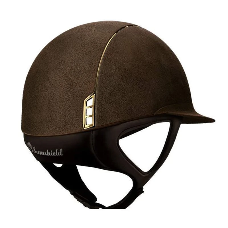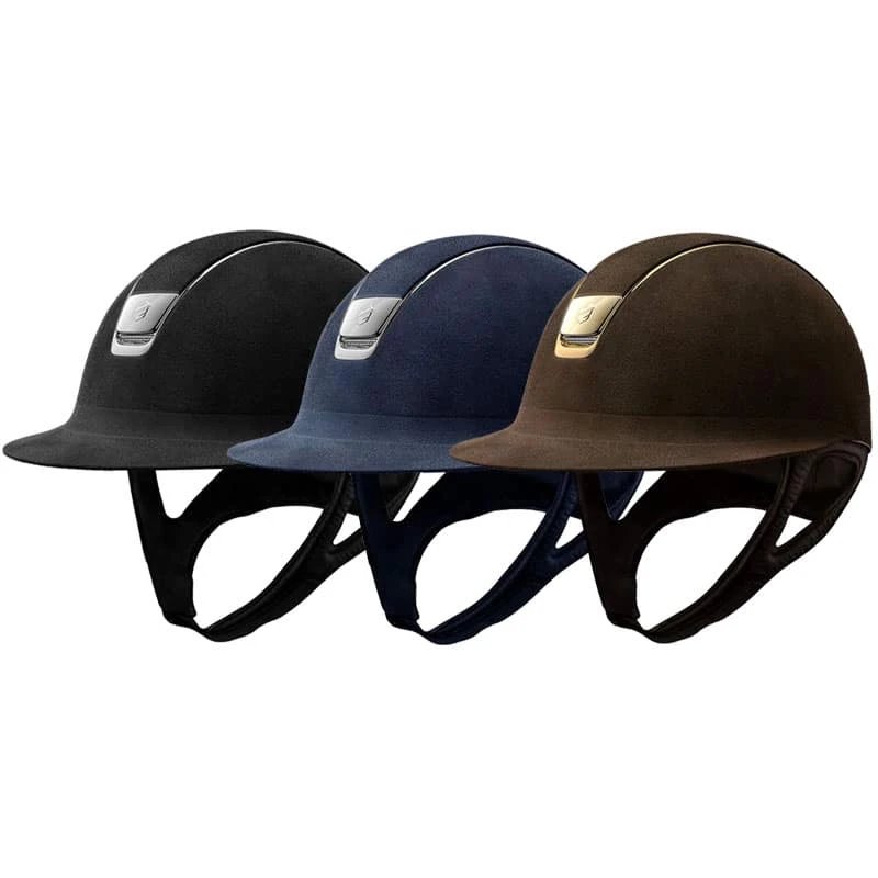 This beautiful Samshield Miss shield helmet has Alcantara suede all over. With this model, the black and blue navy versions have silver chrome blazon and trim, whereas the brown version has a gold chrome blazon and trim. This helmet is perfect for you when simple elegance is something you strive for.