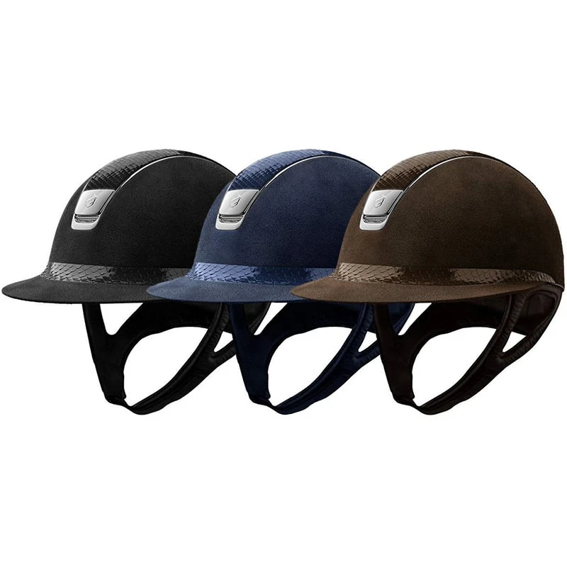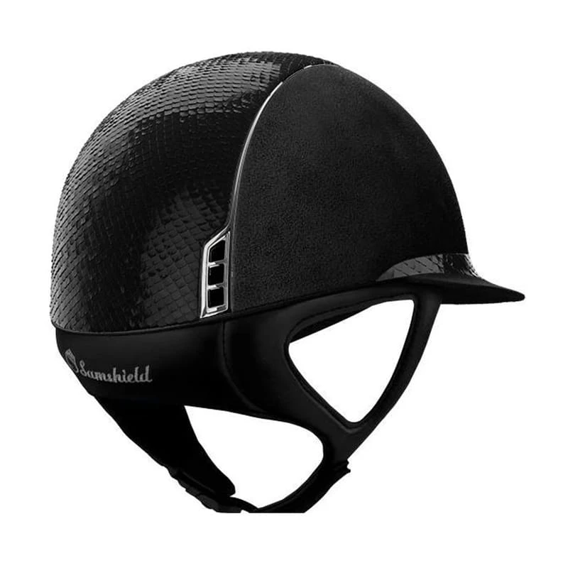 This wonderful Samshield Miss Shield Alcantara Python helmet is made with the shell in Alcantara Suede leatherlook material. The Miss Shield model has a wide visor with a decorative band. The top and band on this helmet are both made in Python snake-skin look material. The trim and logo are made in chrome silver.