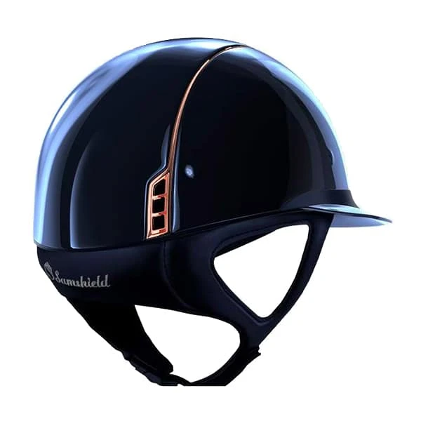 This modern Samshield Miss shield helmet has a glossy shell for an everlasting polished look. The Miss Shield model has an extra-wide visor, to protect from bright sunlight. The helmet is finished with a matte band along the visor, a rose gold chrome trim, and a sparkling Crystal fabric Blazon ensuring a modern and trendy look.