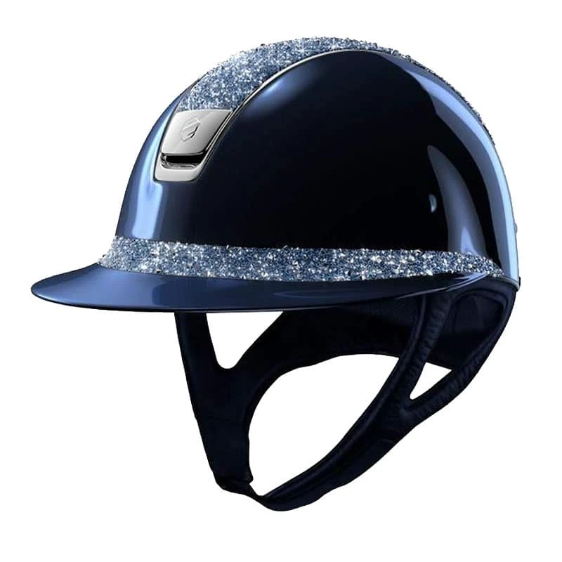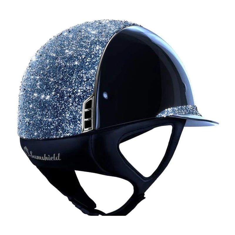 This stunning Glossy Samshield Miss will definitely make you sparkle. The top and band along the extra-wide visor, are inlaid with chunky Swarovski crystal Medly fabric, combined with the silver chrome blazon and trim and glossy shell, this helmet has a contemporary shine.