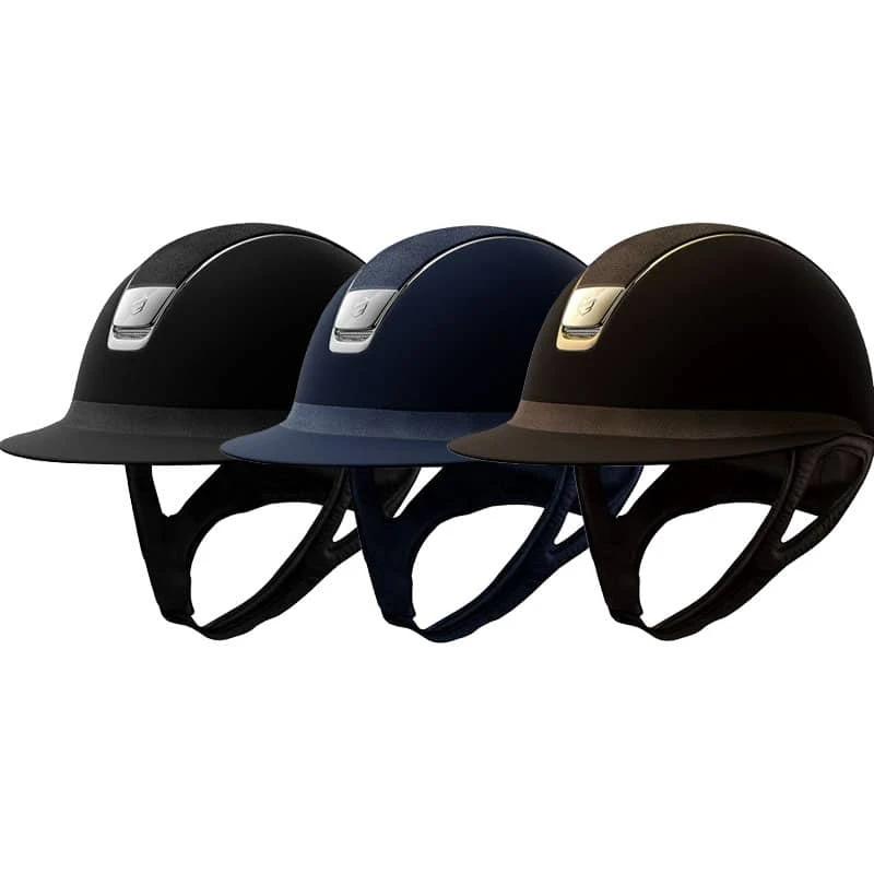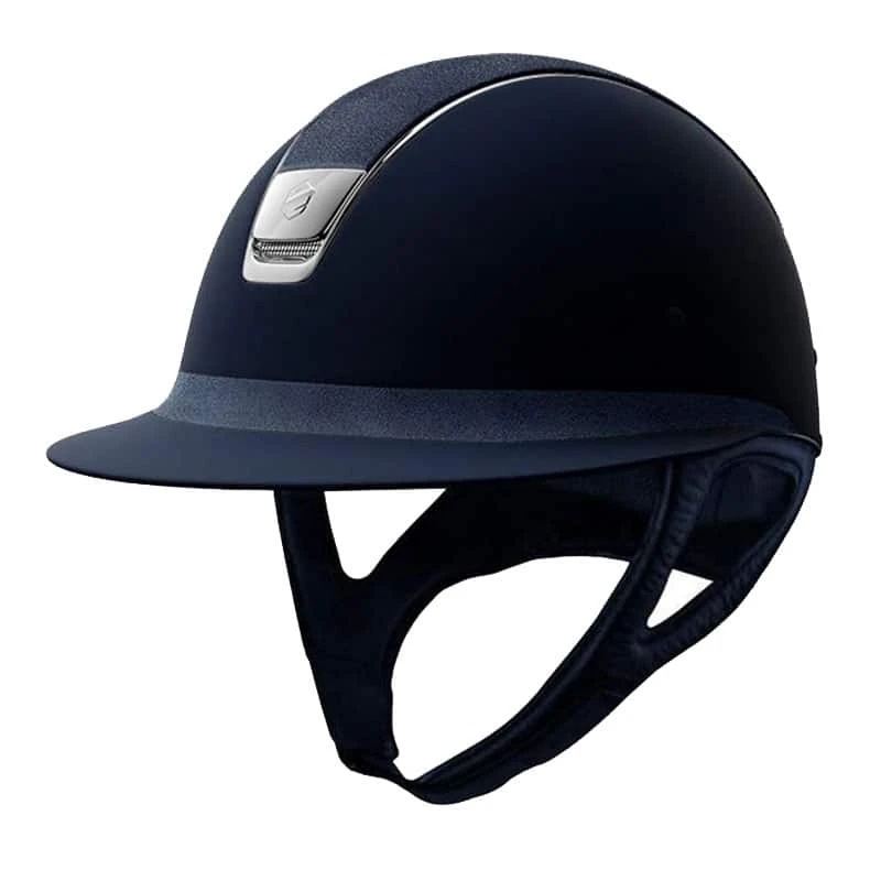 This elegant Samshield Miss shield helmet has the Alcantara microsuede shell giving the helmet a classic look and feel. The Miss Shield model has an extra-wide visor, to protect from bright sunlight. With the blue and black helmet, the chrome details are in silver, and with the brown helmet, the details are in gold.