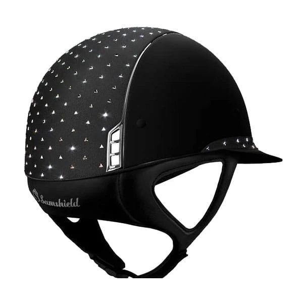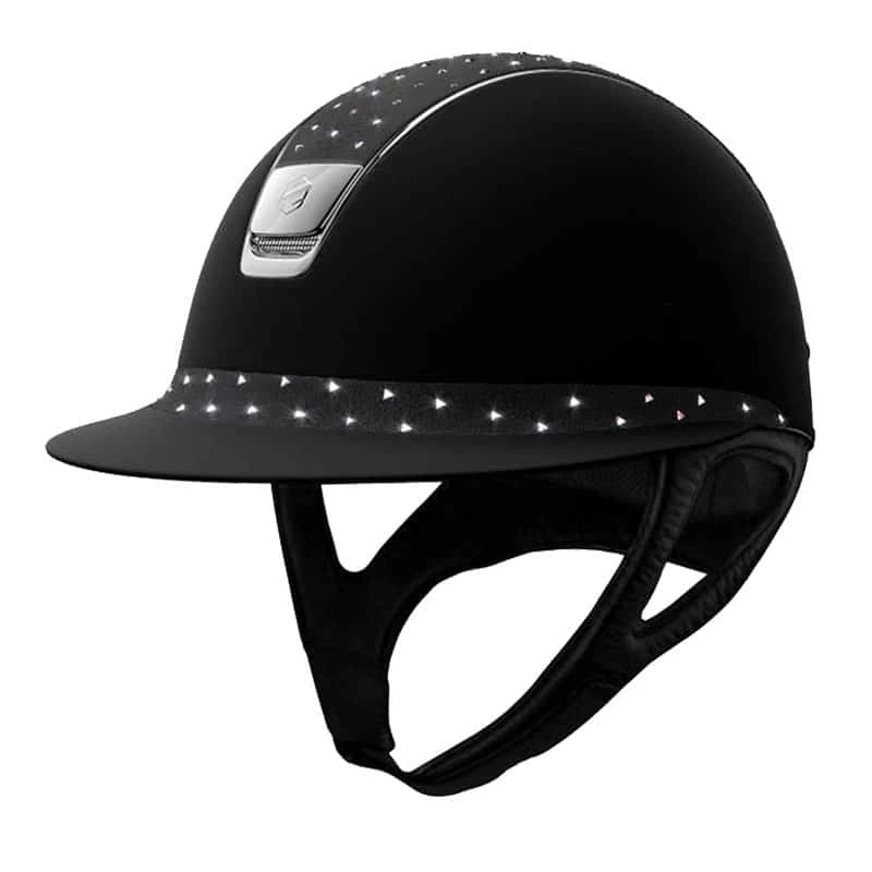 This striking Miss Shield Shadowmatt helmet with a fancy Swarovski top is an absolute looker. The all-over matte shell and silver chrome piping gives the helmet a classy finish. The Alcantara suede top and band along the wide visor are beautifully decorated with Swarovski crystals and gives this helmet a luxurious feel.