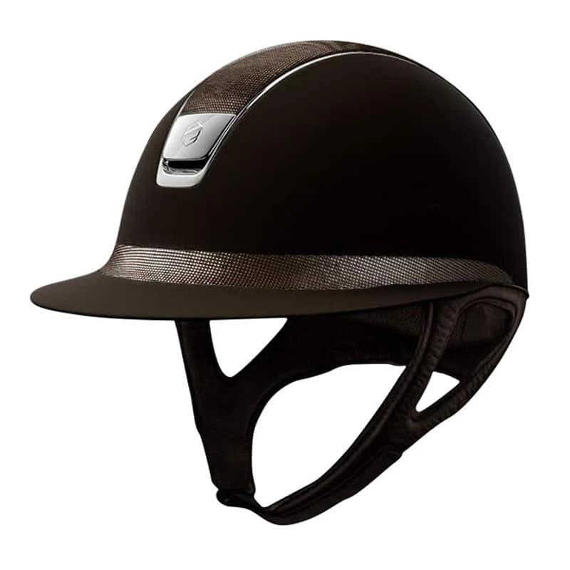 This wonderful Samshield Miss Shield Shimmer helmet is made with the shell in Shadowmatt material. The Miss Shield model has a wide visor with a decorative band. The top and band on this helmet are both made in Shimmer material. The trim and logo are made in chrome silver.
