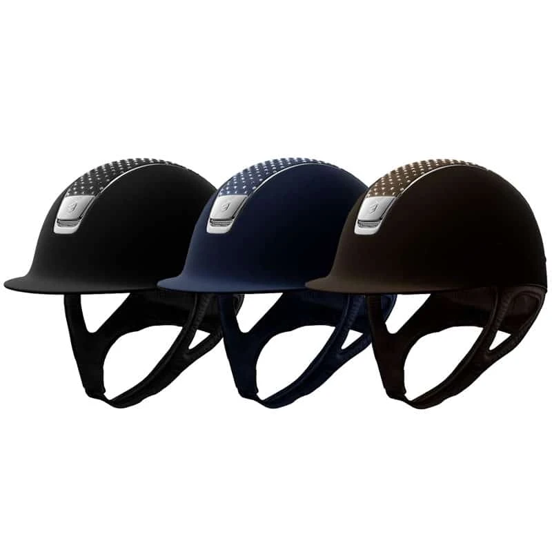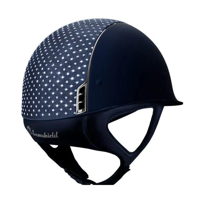 This Samshield Shadowmatt helmet with Sparkling top is an absolute stunner. The top is made of Alcantara suede and is embellished with a sparkling design of Swarovski crystals. The chrome silver blazon and trim give the helmet an elegant look.