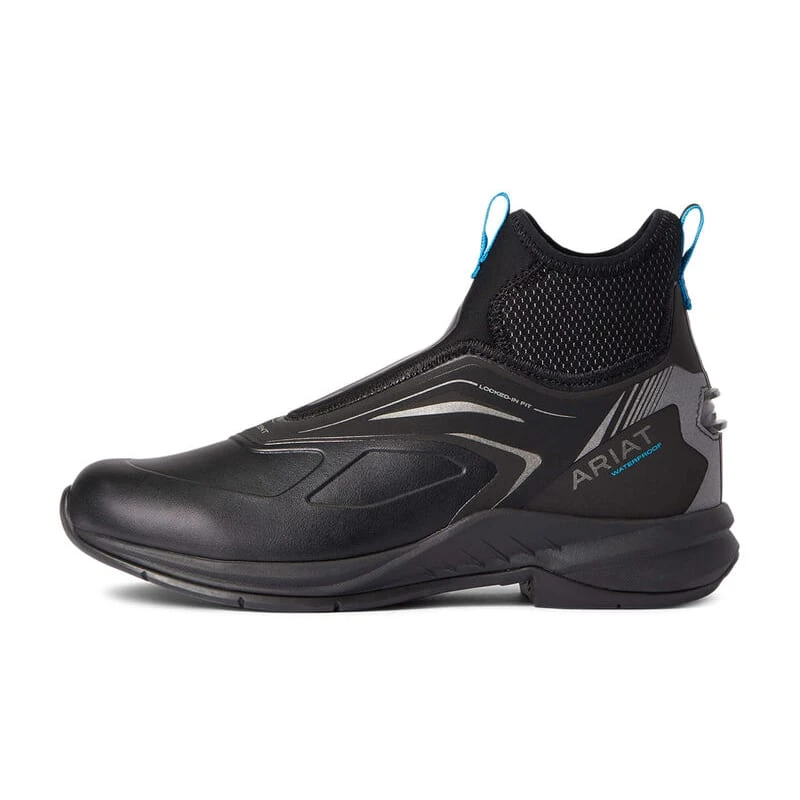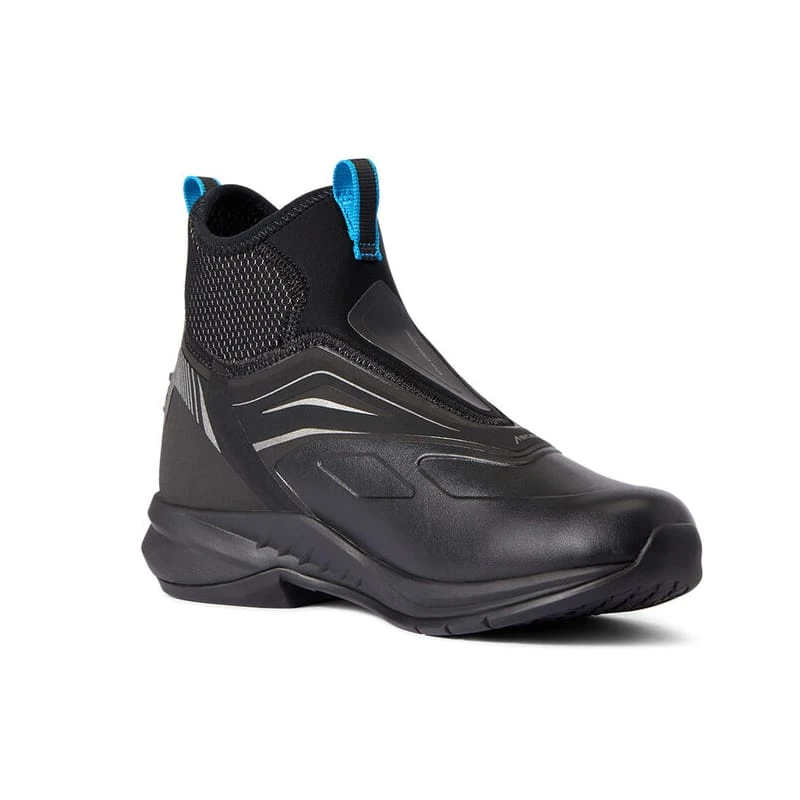 The revolutionary Ascent Waterproof Paddock boot by Ariat delivers premium comfort, optimal stability, and a unique level of style every step of the way. The Ariat Ascent short boot is completely waterproof, but still very strong and durable, making these short boots ideal for working around the stable or for riding in all sorts of weather types. These women’s Ariat Ascent paddock boots come in black with blue details. They include a waterproof PRO construction, a flexible lightweight knit construction, a PRO performance insole, a neoprene stretch collar, and a Duratread outer sole with traction zones.