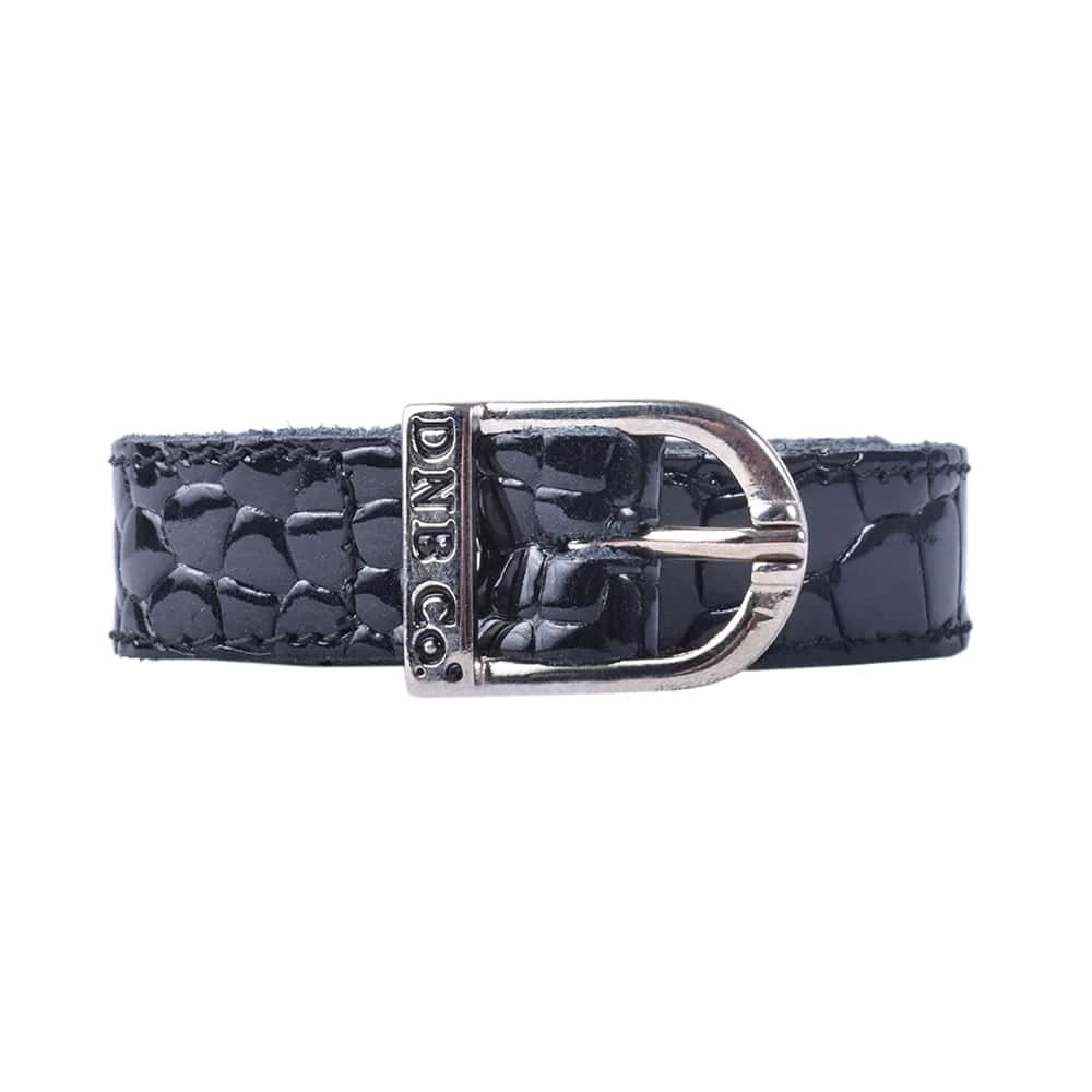 These spurstraps are made in Patent Cocco leather. The spurstraps have a silvercoloured buckle wiht the letters DNB Co on it. De Niro spurstraps are available in several diffent types of leather and in several different colours.