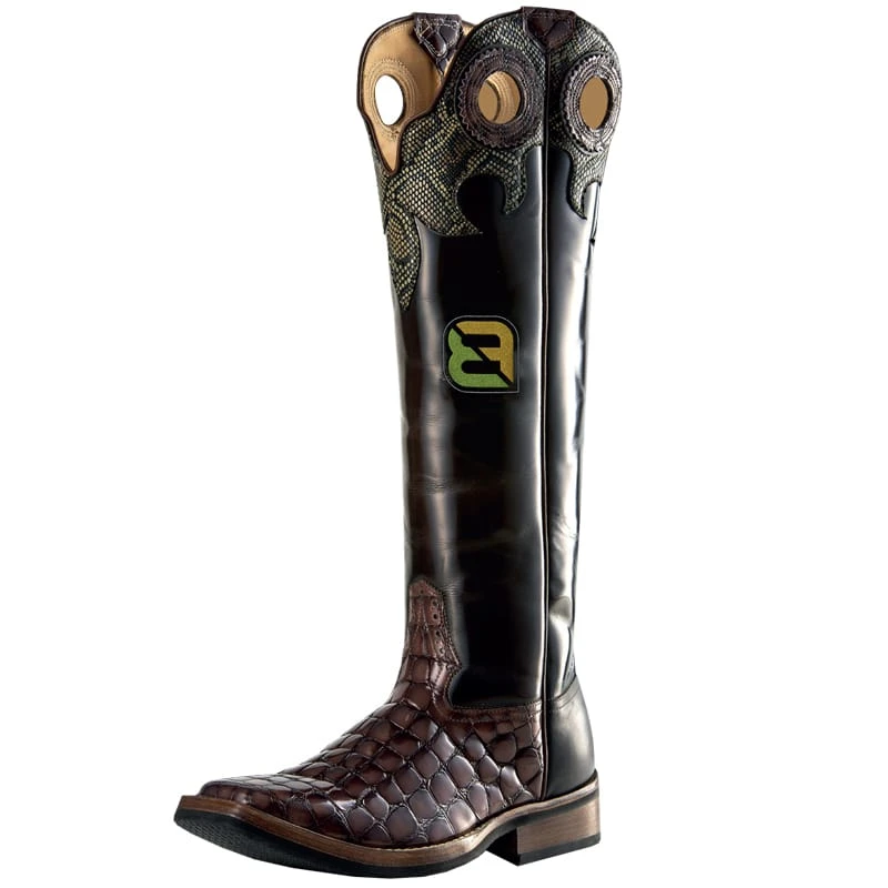 This outstanding Days Cowboy boot is a custom made Cutter boot. Thi model is of medium height and always feature decorated pull holes and classic side welts. This boot features a Buffalo Montus black top and a Buffalo Ka brown vamp. The boots are finished with the square toe Trainer sole.