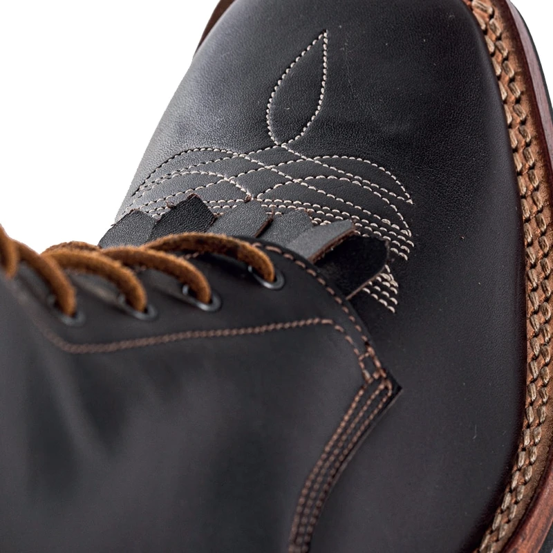 This boot is fully finished Buffalo Caffé. The boots feature the square toe Trainer sole and fancy stitching.