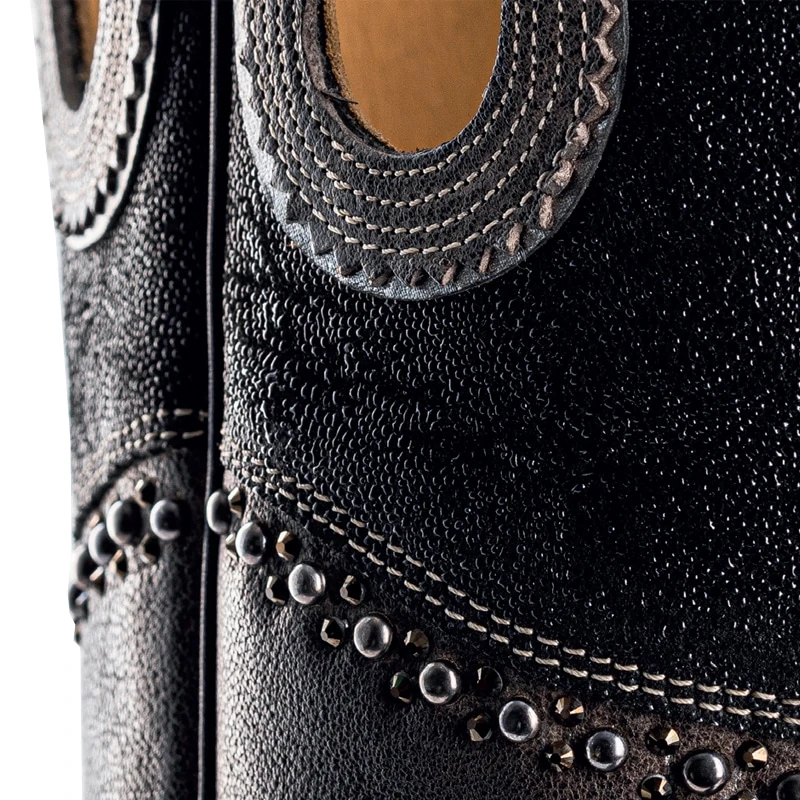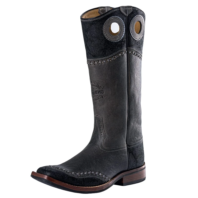 This boot features a Buffalo Montus Grey top and vamp, and is decorated with a toecap heel and top in Plantone BLack. The boots are finished with the square toe Trainer sole and studs and Swarovski decoration.